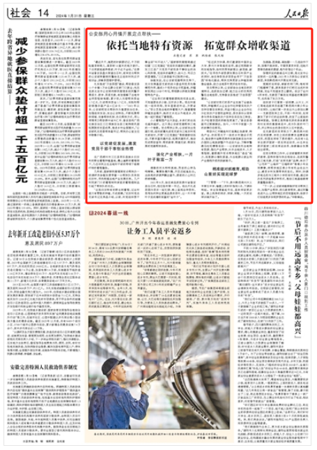 1月31日,人民日报第14版刊发《公安部用心用情开展定点帮扶——依托当地特有资源 拓宽群众增收渠道》,其中报道了公安部党建帮扶广西柳州市三江侗族自治县,带动群众增收致富。