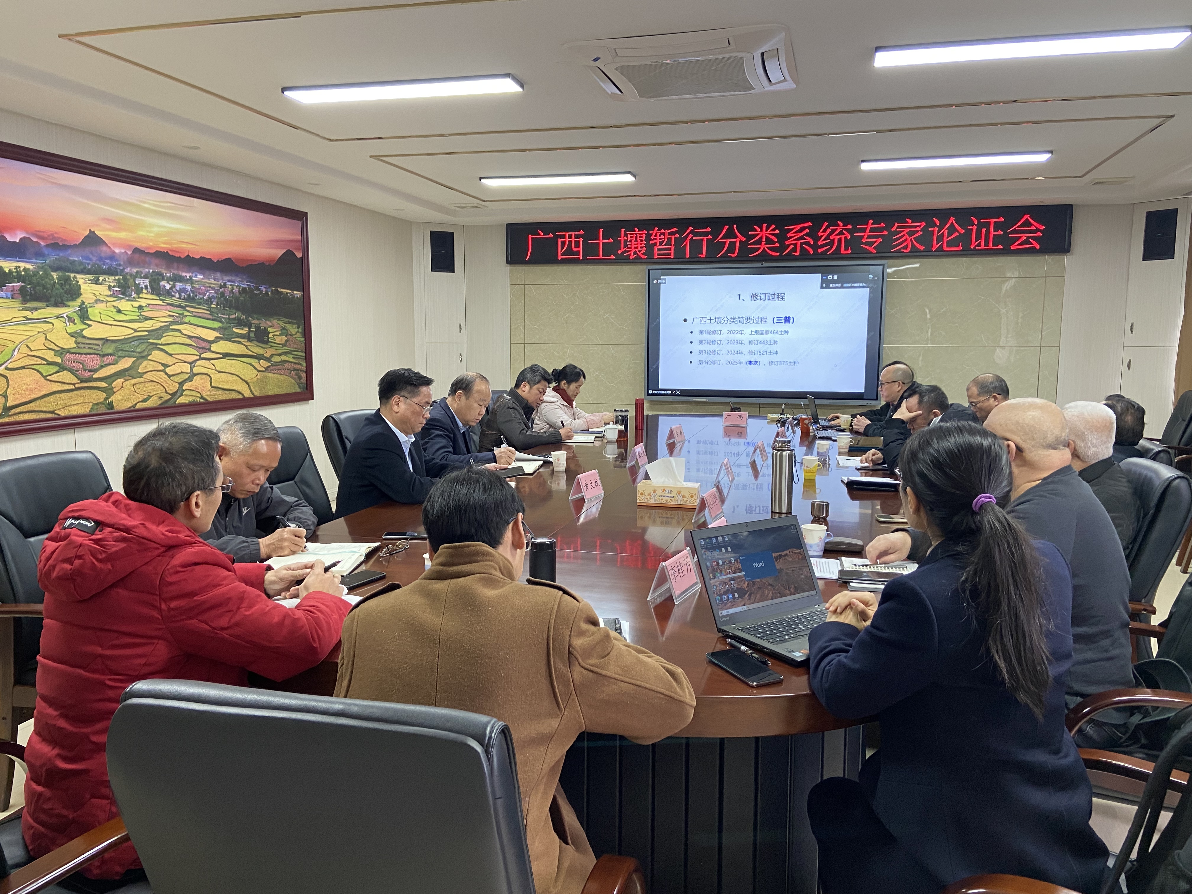 会上,论证专家组听取了修订情况汇报,审阅了广西土壤三普土属土种名称清单、土壤亚类的土种命名指标与方法等成果资料,围绕土种划分、障碍层指标设置等方面给予指导性建议,针对系统分类缺少指标数据、特殊土壤类型界定等问题,根据第三次全国土壤普查暂行土壤分类系统的要求,结合广西区域情况进行研讨交流。论证专家组经过质询讨论,形成论证意见,同意广西三普暂行土壤分类系统成果通过论证。