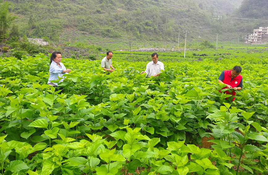 广西河池市东兰县金谷乡隆明村,驻村工作队员和村民一起打理桑园。东兰县融媒体中心供图